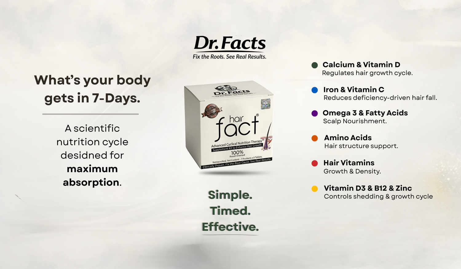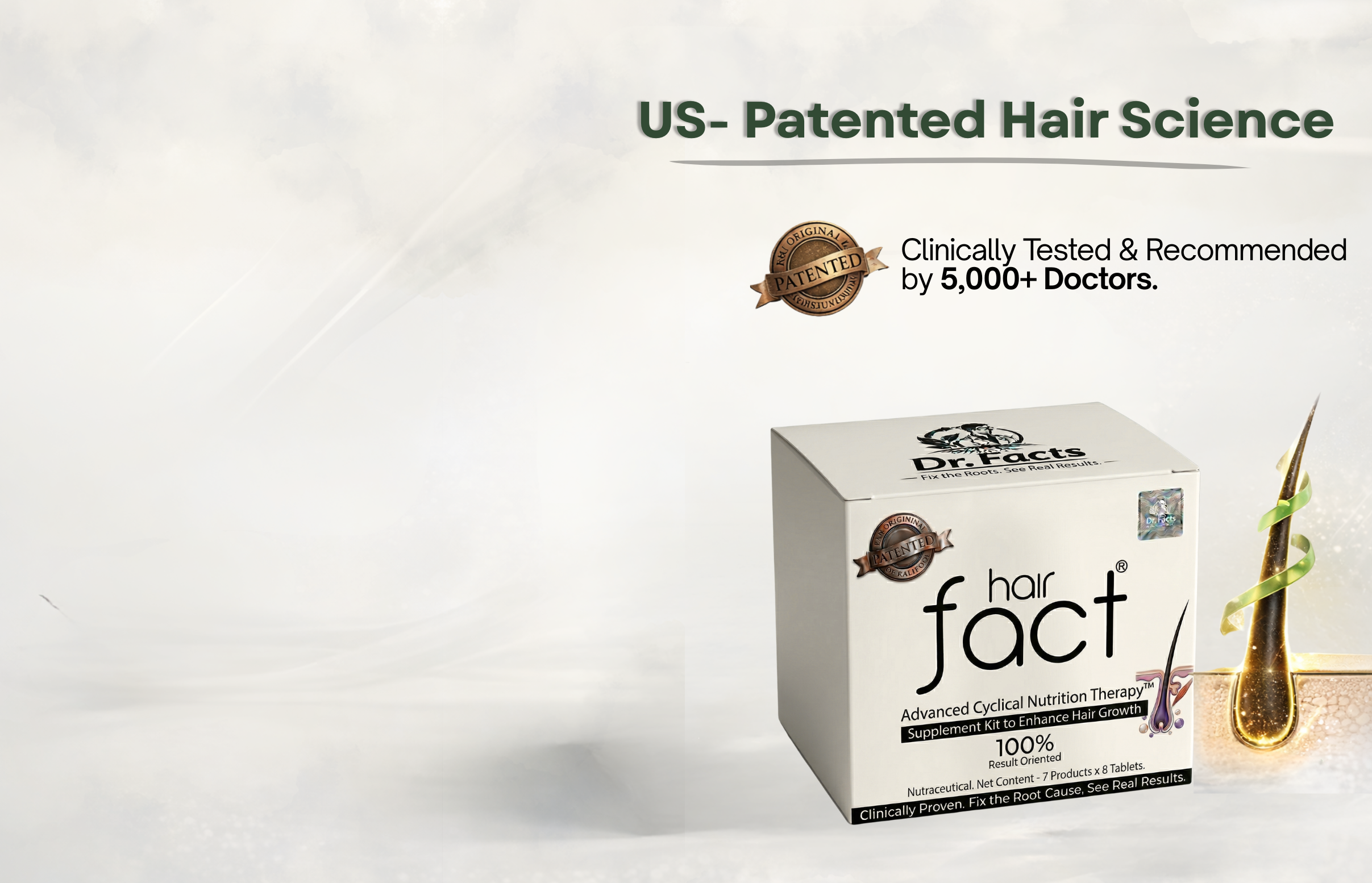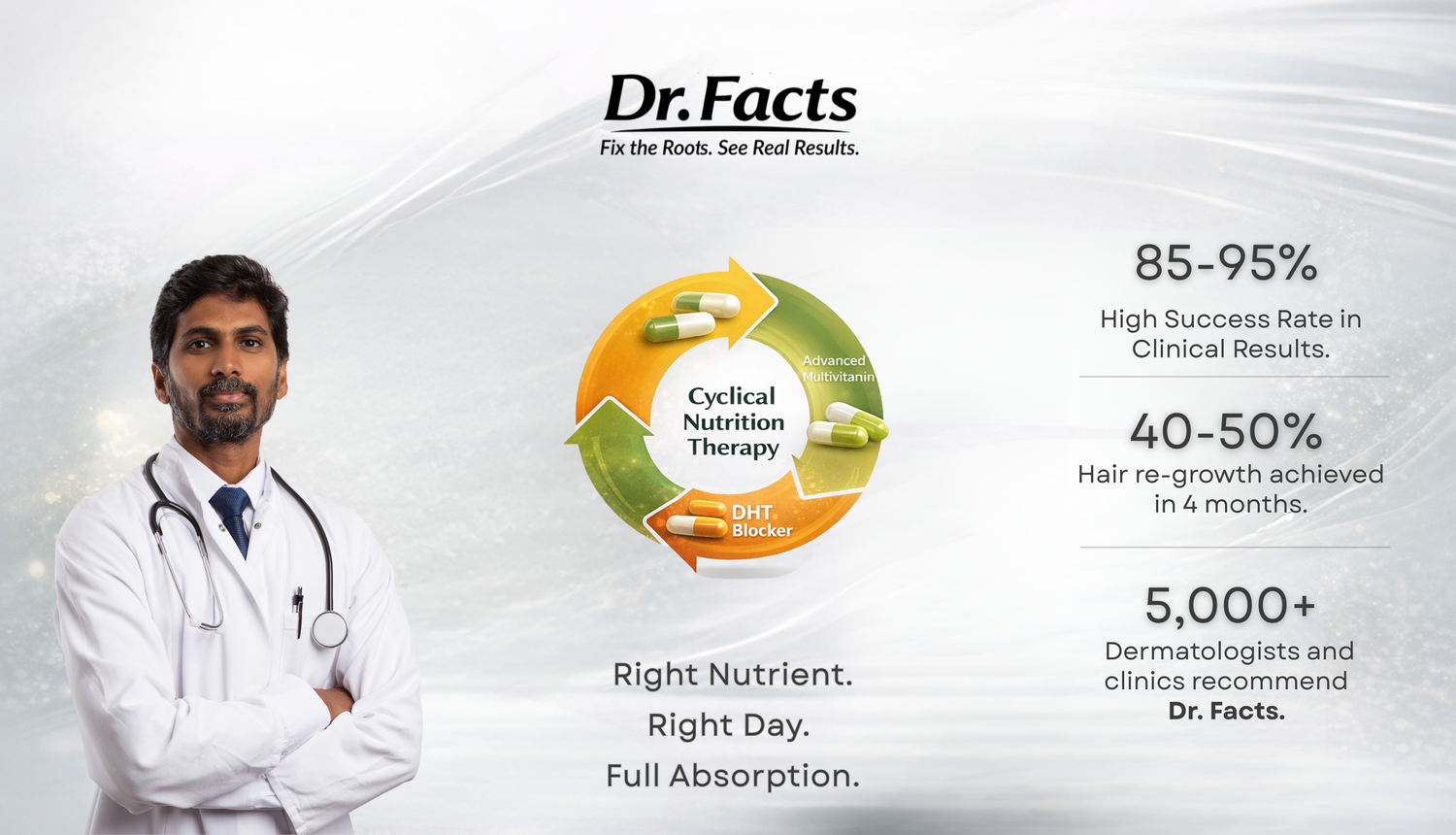 Dr. Facts is India’s first hair supplement built on US-patented Cyclical Nutrition Therapy (CNT) — a 7-day system that gives your body the right nutrients at the right time.